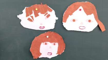 自分の顔と手を画用紙で作って貼り、インクをつけて刷りました。まるでこちらに向けて話しかけているような、素敵な紙版画が完成しました。作品のタイトルは、作品が何と話しているか考えて、「おはよう」や「いっしょにあそぼう」「作ってくれてありがとう」など、工夫してつけることができました。