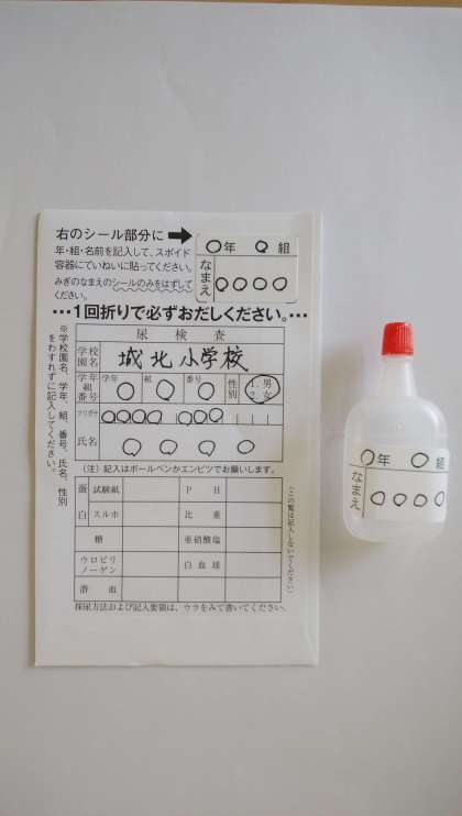 明日、尿検査があります。本日、児童に「尿検査のお知らせの手紙」と「尿検査キット」を配付しましたので、ご確認ください。