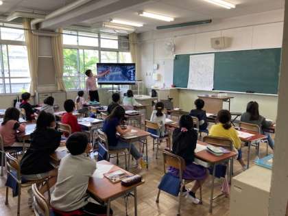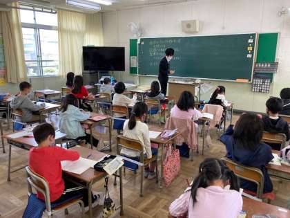 緊急事態宣言の期間中、2クラスに分かれて学習に取り組んでいます。一方のクラスでは社会の学習をし、もう一方では算数の学習をしました。4時間目は先生を入れ替えて同じ内容を学習できるようにくふうしています。