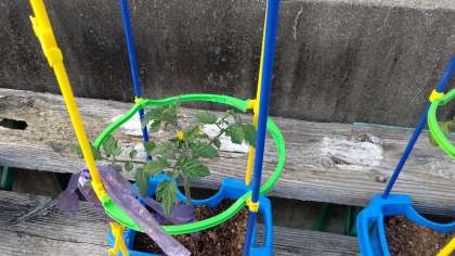 子どもたちは、ミニトマトの苗植えや支柱立てをしました。ビニールポットから、土ごと苗を取り出し、鉢に植えました。