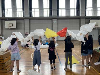 ふわふわの感触の心地よさを味わいながら,自由に組み立てて楽しんでいました。空気をどうやって袋につめるかを工夫しながら、みんなで協力して考えていました。