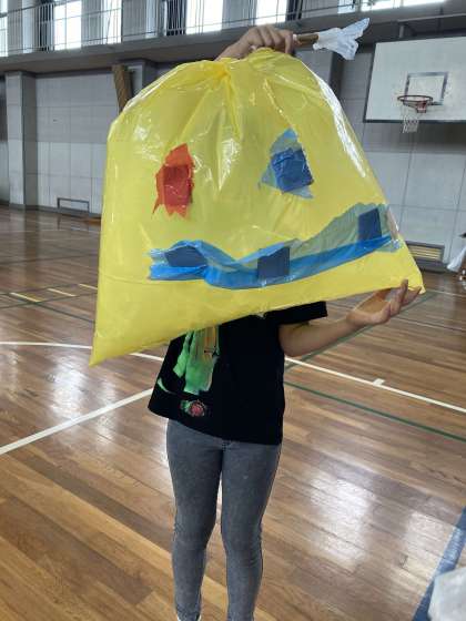 図画工作科で、大きな袋を積み木に見立てて造形遊びをしました。