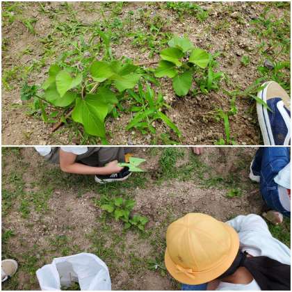 サツマイモの周りの雑草抜きをしたり、これから植える植物のために土を耕したりしました。