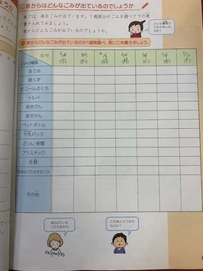 週末に、家庭で出るごみの種類を調べてくる宿題を出しています。お忙しい中ですが、ご協力よろしくお願いいたします。
