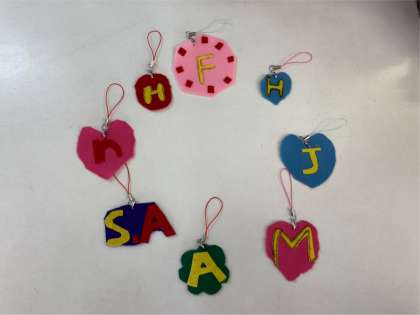 その後は、フェルトを使ってキーホルダーを作りました。先生の説明を聞きながら、集中して活動できたので、かわいい作品が出来上がりました。作ったキーホルダーは、筆箱につけたり、それぞれ好きなところにつけています。お家で見かけたら工夫したところなど、ぜひ話を聞いてあげてください。