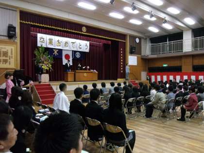 午前10時に卒業生が入場。「卒業証書授与」の場面では、一人一人が将来の夢を発表し、校長先生からしっかりと卒業証書を受け取りました。校長先生やPTA会長、そして地域の代表の方からのお話を真剣に聞く卒業生の姿に、6年間の成長を感じました。
