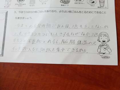 朝ごはんのはたらきについて学習し、バランスの良い朝ごはんの献立を考えました。理科で学習した内臓のはたらきなどとも結びつけて教えていただいたので、子どもたちは「あぁ〜」「なるほど」と納得した様子でした。