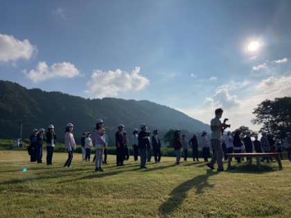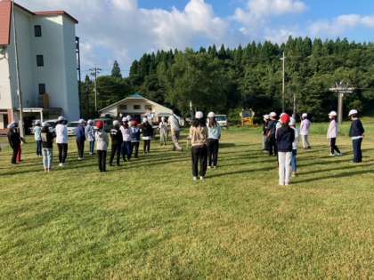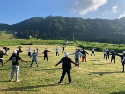 今日の活動を確認し、高原の気持ちの良い空気の中でラジオ体操をしました。子どもたちは元気です。