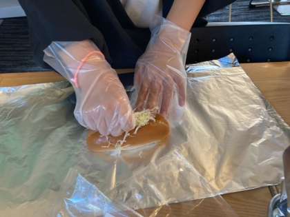 チーズ、キャベツ、ソーセージの順に挟みます。