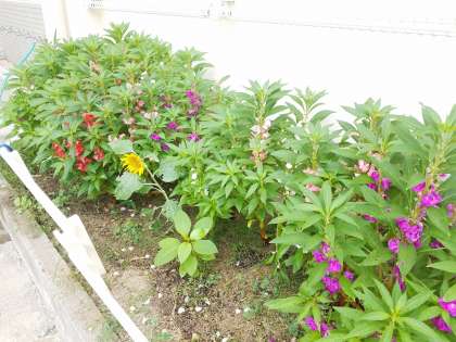 運動場わきの花壇には、「ホウセンカ」の花が満開でした。