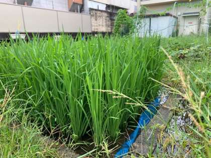 写真は5年生の植えた稲です。雨にも負けず、元気いっぱいに育っています。