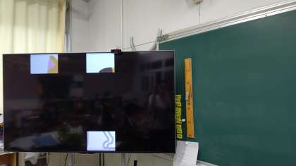 画像クイズでは、電子黒板で、少しずつ見えていく動物が何かを考え、覚えた英語で答えることができました。ちなみに、右上の画像の答えは、“cat”です。