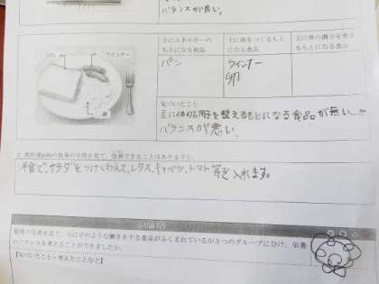その後で、教科書の朝食に足りない栄養を考え、どんなメニューなら自分でも取り入れられそうかを考えてワークシートに書き込みました。