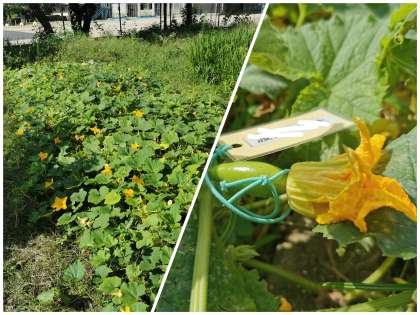 学習園をのぞくと、カボチャの黄色い花があっちにもこっちにも。そこで、「おばな」の花粉を「めばな」につける受粉を体験。「おばな」と「めばな」を見分けて、自分たちの手で受粉させました。うまく成長すれば、だんだん実がふくらんでくるはず!