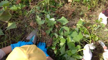 一生懸命、雑草抜きをして、育ててきたサツマイモです。傷つけないように、そっとスコップや軍手をはめた手で掘っていました。