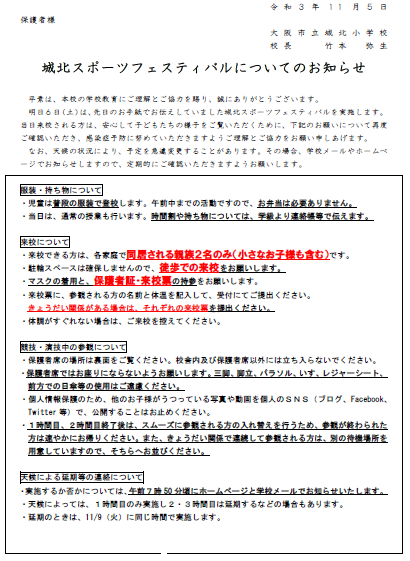また、本日スポーツフェスティバルについて手紙を配付しました。