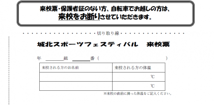 いよいよ、明日は城北スポーツフェスティバルです。登校は、いつもと同じさそい合い登校ですので、ご家庭の方で送り出してあげてください。