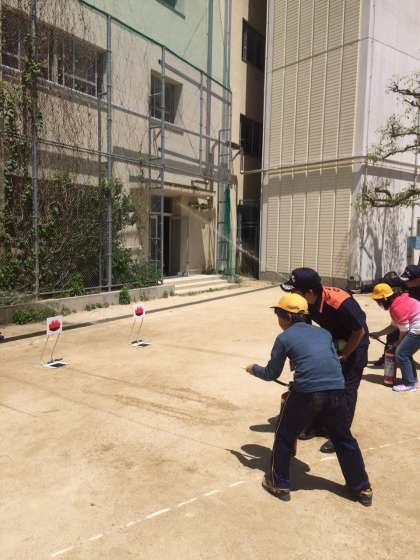 消火器の使い方を消防士さんから教えていただき、的に向かって水を出しました。