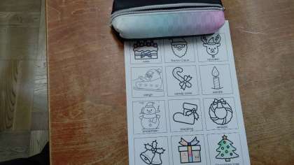 最後に、クリスマスソングをBGMに、クリスマスワードの絵に色を塗りました。「レッド」「ブラック」など塗りたい色を発音しながら、集中して塗ることができました。きれいに塗ることができているので、出来上がったら「神経衰弱やかるたなどに使いたいね」と話しています。