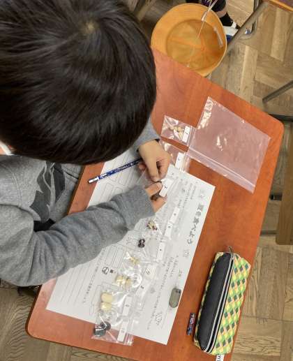 次に、豆の種類について学習しました。10種類の豆の実物を見たりさわったりしながら、さまざまな豆の名前を知ることができました。はじめて聞く名前の豆もあり、興味深そうに観察していました。