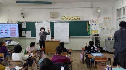 まず、歯の働きについてスライドを見ながら学習しました。かむことが主な働きですが、歯を食いしばって力を出すので、スポーツをするときにも歯が大切だと知って、子どもたちは驚いていました。