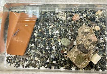 冬休みの間、学校の生きものも寒さに負けないように過ごしています。その中でも特に元気なのが、ザリガニの赤ちゃんです。水槽の中を歩いたり、ごはんをモリモリ食べて力をつけたりして、みなさんが来るのを待っているようです。写真をよく見ると、小さなザリガニの赤ちゃんが写っています。ぜひ探してみてください。