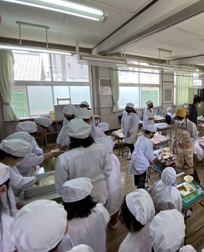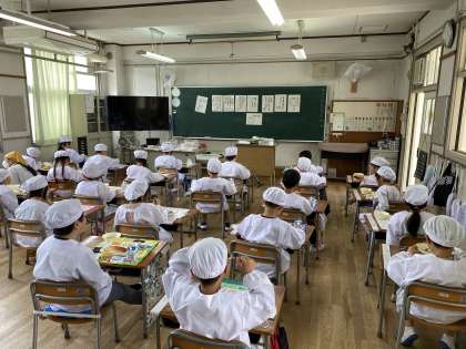 給食の時間になると、6年生のお兄さんお姉さんが1年生の給食を届けてくれます。今日から、6年生が注いでくれた食器を自分たちで運びました。6年生にやさしく教えてもらいながら、少しずつ自分たちでできることが増えています。今日はカツカレーライスでした。たくさんの児童が完食しおかわりもしました。