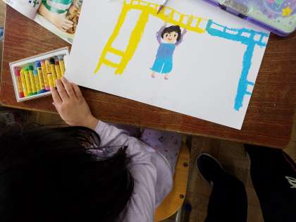 好きなことを聞いてみると、「ジャングルジム」「ドッジボール」「ブランコ」とそれぞれの好きなことを活発に発表し、「はやく描きたい!」とパスを片手にうずうずしている様子が見られました。