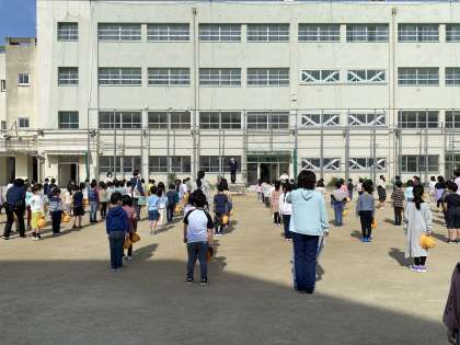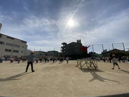 今日から児童朝会に一年生が参加し、ラジオ体操も始まりました。