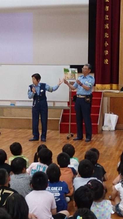 旭警察署のお巡りさんにお越しいただき、正しい歩行の仕方や安全な自転車の乗り方について学習しました。