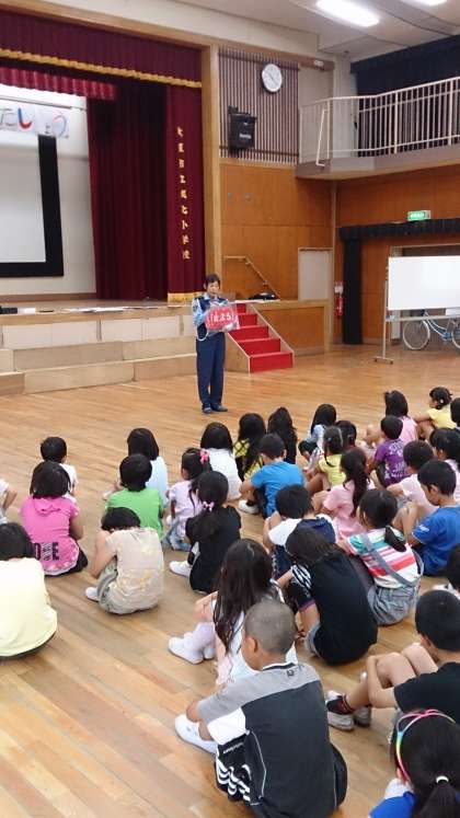 交通安全指導では、実際の場面や交通標識のカードを使って、分かりやすく教えていただきました。