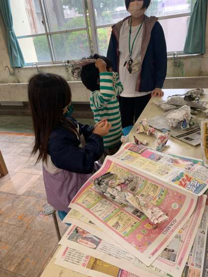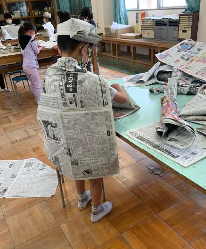 丸めたり、にぎったりすると簡単に形の変わる新聞は、図工の学習で大活躍の教材です。「新聞紙を体に巻き付けたり、頭にのせたりすると楽しいよ」と紹介すると子どもたちの目はキラキラ輝き、夢中になって活動をしました。友だちと一緒に迷路を作ったり、ヒーローに変身したりと、とても楽しそうでした。
