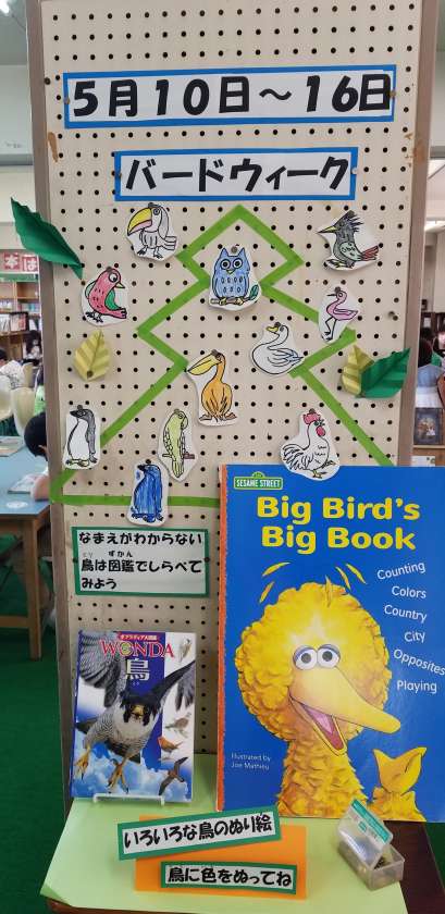 愛鳥週間に合わせた掲示は、色とりどりのかわいらしい鳥さんでいっぱいになりました。低学年を中心にたくさん塗り絵をしてくれたようです。