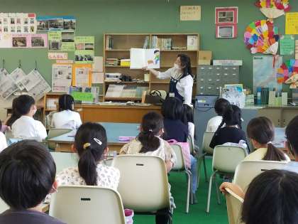 2年生の図書の時間では「これはのみのぴこ」という絵本を、図書館司書の方に読み聞かせをしていただきました。繰り返しの表現がとても面白く、子どもたちは次第にお話にひきこまれ、たくさん笑っていました。