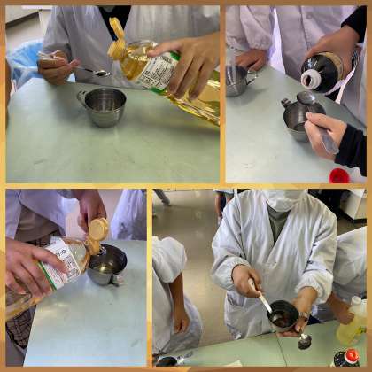 計量スプーンを使い、人数分を計算しながらサラダ油やお酢などの量を計ってドレッシングが完成です。
