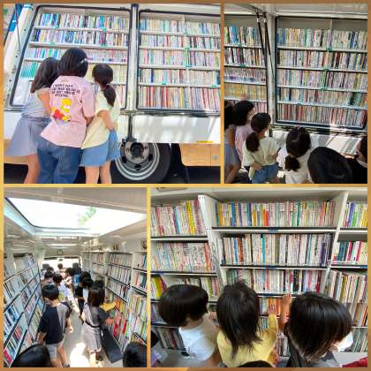 「まちかど号」は、全部で105か所も回っていて、1か月で30冊借りかれるそうです。中でも、「まちかど号」に積まれている本は約3000冊で、中央図書館にある事務所には、9万冊もあるということを聞いて、子どもたちはとても驚いていました。実際に中に入ってみるとたくさんの本がありました。