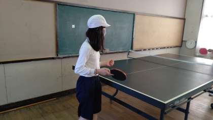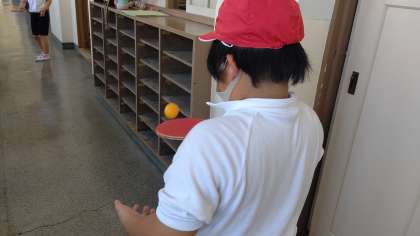 ピンポン玉を何回連続で打ち上げられるかのゲームをしたり(100回連続を達成した児童もいます)、ピンポン玉をラケットにのせて落とさずに進むリレーをしたり、ラリーの練習をしたりしました。