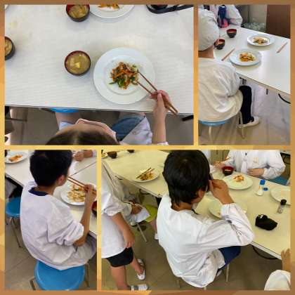 完成したものをみんなで食べました。普段は野菜が苦手な子もみんなで作ったのでおいしく食べられたようです。たまねぎにしっかり火が通っていて、玉ねぎの甘みがしっかり感じられました。みそ汁も上手にできたようで、「サツマイモが柔らかくておいしい!」と言っている班もありました。