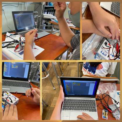 最後には、光センサーを活用し、明かり時には、電気が消え、暗いときにはつくようなプログラムも作ることができました。子どもたちは、センサーを手で隠したりしながら、楽しんで学ぶことができました。