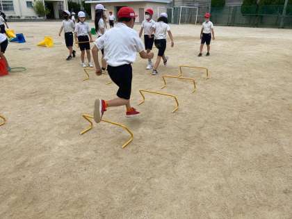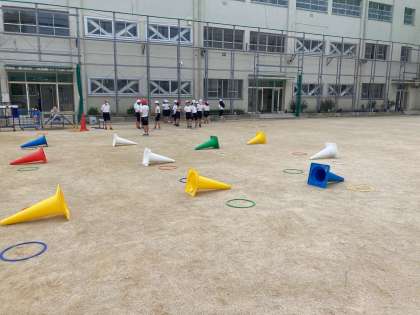 ミニハードルやフープ、コーンを使って班ごとに「リズム良く走り抜けられる」コースを作りました。