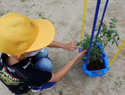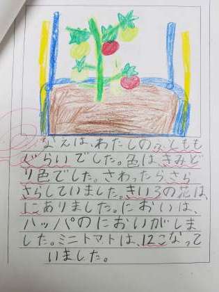国語科では、観察したことを分かりやすく書くためには、どんなことを書くとよいかを学習しました。大きさは、何かと比べて書くとよいこと、色やにおい、触った感じなどをかくとよいこと、数字を使って記録するとよいことなどを学習し、実際にミニトマトを観察に行きました。
