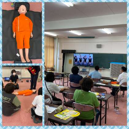 教職員で「救命救急講習」を行いました。旭消防署から3名お越しいただき、「一次救命処置」について教えていただきました。
