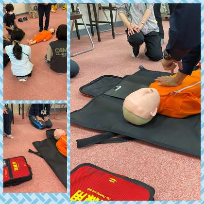 また、心肺蘇生訓練用の人形を使い、胸骨圧迫とAEDの使い方についても説明していただきました。プールサイドでの使用も想定して、実施しました。
