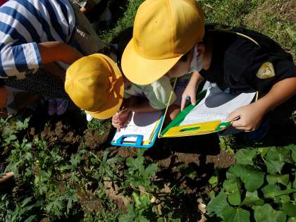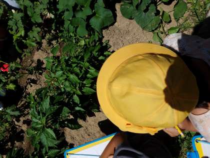 「オクラは上向きにできるんやな」「ピーマンはまだミニトマトくらいの大きさや」「オクラの花は薄い黄色で、ピーマンの花は白色」と、国語科で学習したことを活かし、しっかり観察することができました。