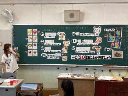大宮小学校から栄養教諭の藤井先生に来ていただき、よくかんで食べるとよい7つのことについて、教えていただきました。
