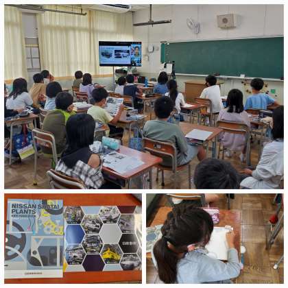製造工程や日産の技術、ロボットや人の働きなど、普段は見れない工場内部の動画を見ながら学習することができました。1つ1つの工程に「ロボットがたくさん仕事してるんや!」と驚いたり、「検査に通らなかった車はどうなるのか?」と質問したり、子どもたちは楽しそうに学んでいました。