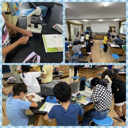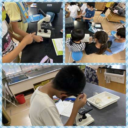 昨年度育てていた、ヘチマとカボチャの花粉を顕微鏡で観察しました。観察して気づいたことをグループで共有し、まとめました。