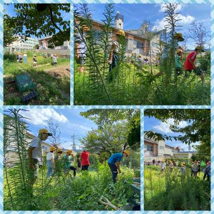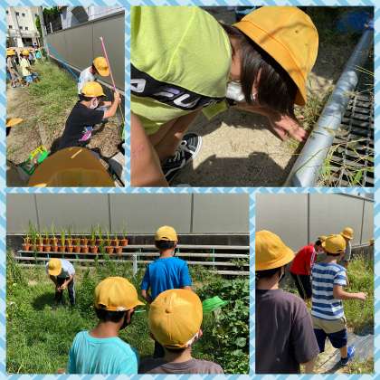 バッタを捕まえるクループや、チョウを捕まえるグループなどに分かれて、学習園で虫取りをしました。
