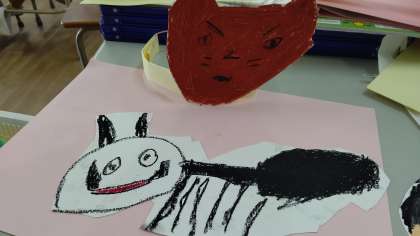 教科書そっくりのねこや、オリジナリティあふれるあり、おかっぱ頭のりっちゃんなど、それぞれの役のお面を作りました。