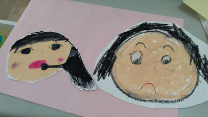 ナレーターは、マイクの絵にしようかと担任たちは話していたのですが、2組の児童の「自分の顔の絵にヘッドマイクをつけたらどうかな。」という素敵な案にみんなで大賛成し、かわいいお面ができあがりました。